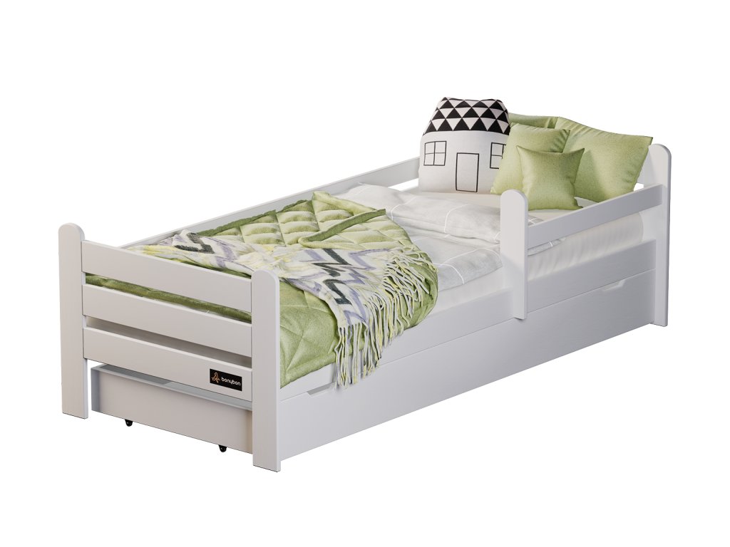 Posteľ je dodávaná s kvalitným roštom z borovicových lamiel, spojených páskou, a praktickou priestrannou zásuvkou na kolieskach pre jednoduché ukladanie vecí.