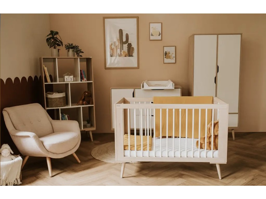 Bezpečná a štýlová postieľka v nádherných prírodných tónoch s polohovateľným dnom a vyťahovateľnými priečkami pre pohodlný spánok vášho bábätka.