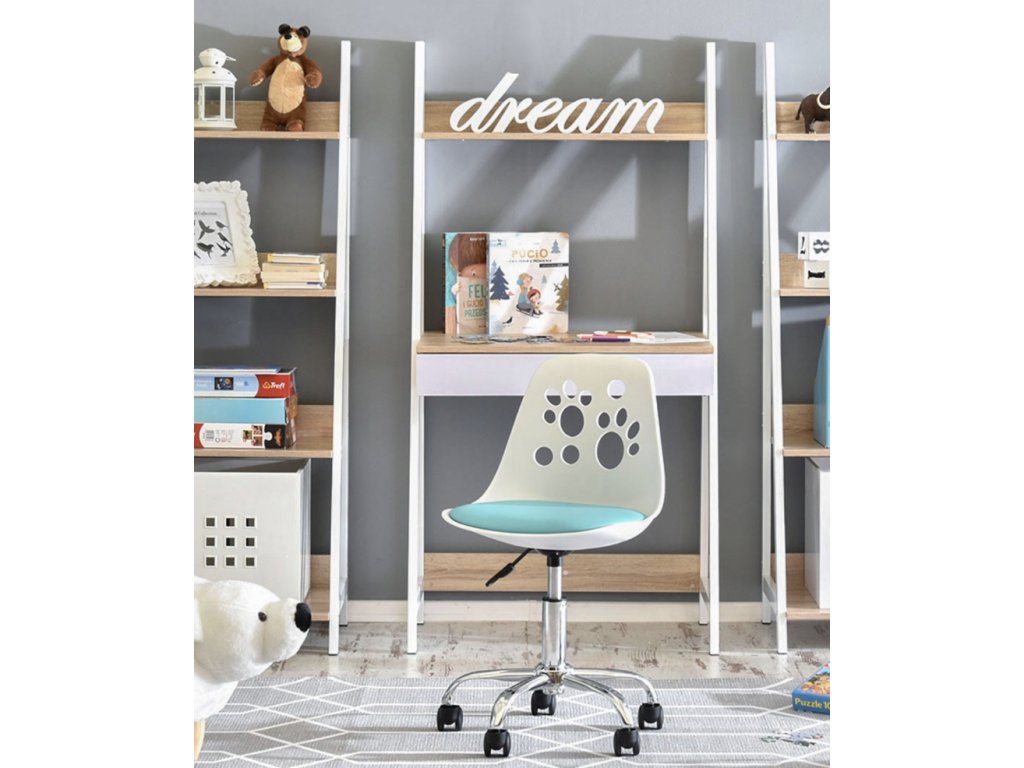 Detská otočná stolička k písaciemu stolu s labkami na chrbtovej opierke, ktorá Vás zaujme hneď na prvý pohľad svojím hravým dizajnom a dokonalou ergonómiou. Je ideálnym kúskom pre malého študentna či študentku do detskej izbičky. Stolička poskytuje komfortné sedenie, pričom je vyrobená z pevného a primerane pružného materiálu. Výšku je možné ľubovoľne nastaviť prostredníctvom páky. Medzi hlavné výhody stoličky patrí funkčnosť, hravý dizajn a kvalita :). Materiál sedadla je vyrobený z kombinácie polypropylénu a vankúš z ekokože.