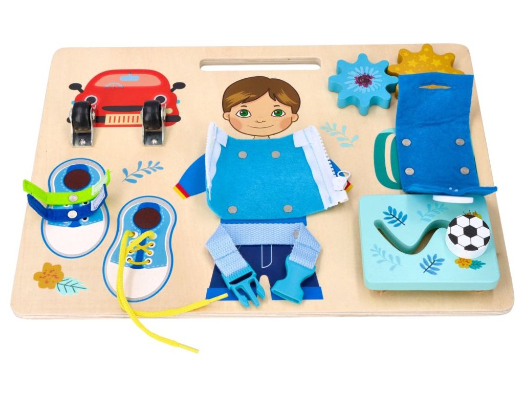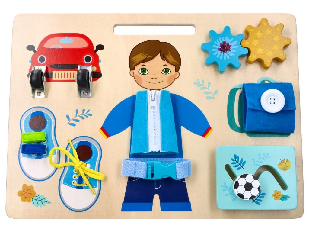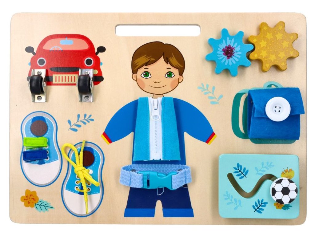 - nácvik motoriky ruky vďaka rôznym zámkom a uzáverom, ktoré sa dajú otvárať + nácvik šnurovania