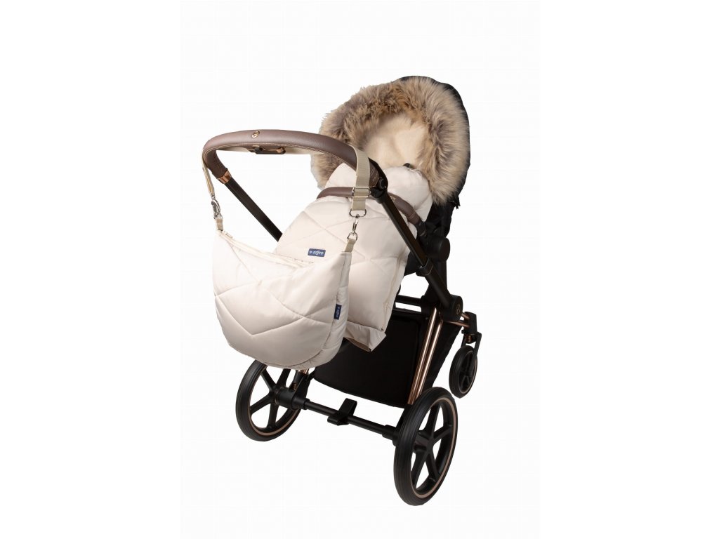 Detský zimný fusak s kožušinou a prírodnou prémiovou ovčou vlnou v prekrásnej smotanovej farbe. Voo fusáku nájdete aj zladenú praktickú tašku na odkladanie veci, ktorá slúži ako taška aleboo dlhá nadstavovacia časť.