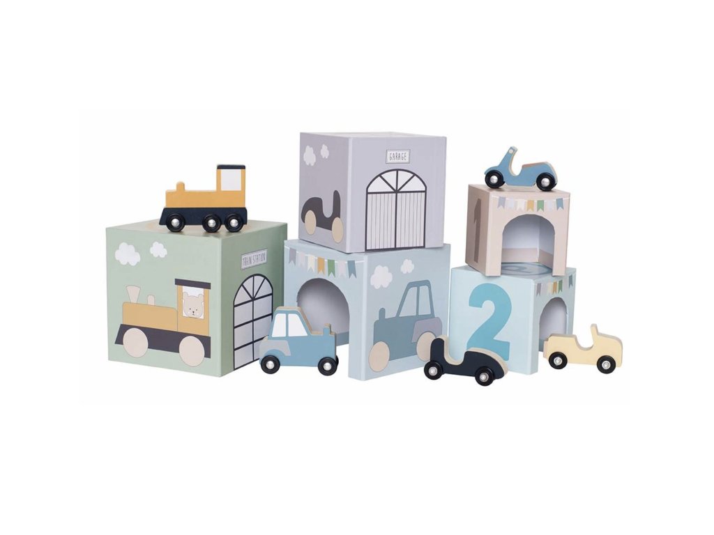 Aktívna hračka pre deti, ktorá stimuluje rôzne zmysly dieťaťa. Sada obsahuje 5 farebných stohovateľných kociek z tvrdeného kartónu s motívom dopravých